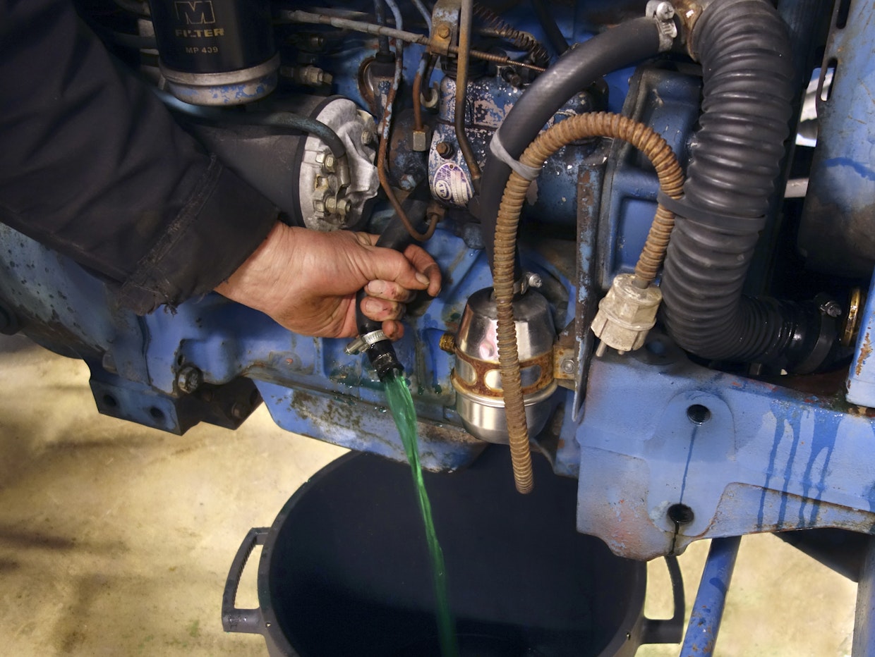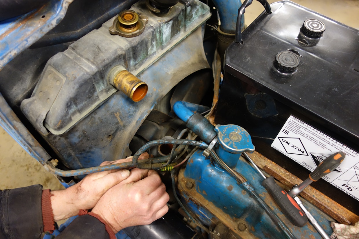 Vanhan jäähdytysnesteen valuttamiseksi on jäähdyttäjän alareunassa sekä vasemmalla puolella lohkon kyljessä poistohana. Hanan paikalla oli nyt lohkolämmittimen letku, joten neste oli valutettava letku irrottamalla. Kuva: Jussi Laukkanen