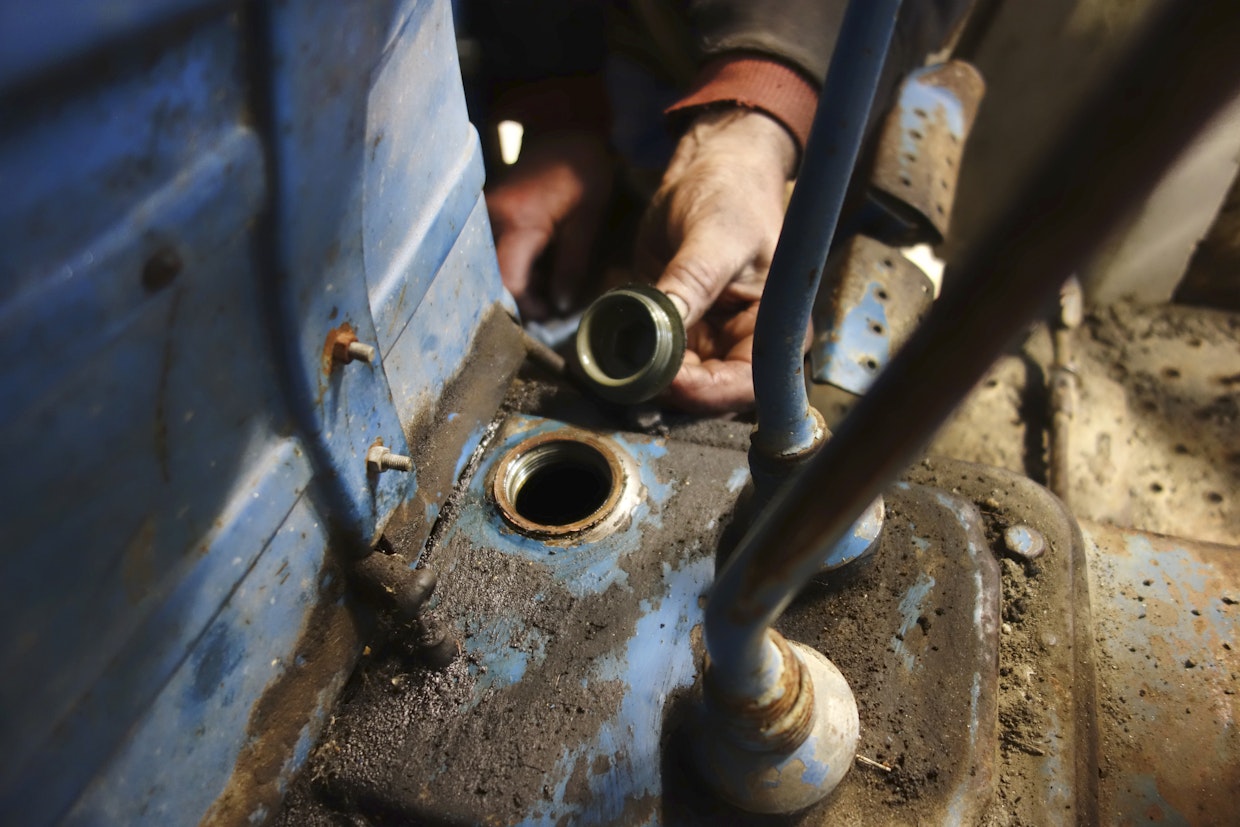 Ford 4000 -sarjan vaihdelaatikon korkissa ei ole mittatikkua. Kun öljytason tulppaa ei tässä traktorissa pystynyt avaamaan, tehtiin korkeustason tarkastus puukepillä, johon oli merkitty viivoilla täyttökorkin ja korkeustason tulpan välinen matka. Kuva: Jussi Laukkanen