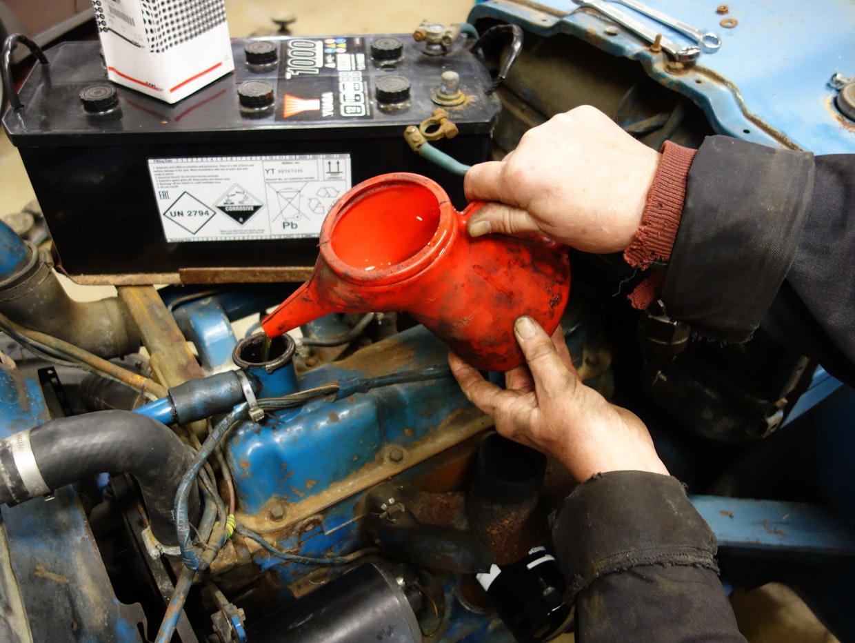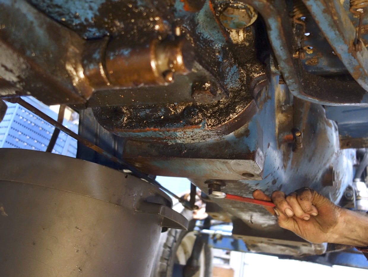 Varsinkin silloin, kun traktori on ollut pitkään ulkovarastoinnissa, on järkevää vaihtaa voimansiirron öljyt. Suhteellisen pieni määrä vettä riittää pilaamaan öljyn ominaisuudet. Tässä tapauksessa uutta öljyä menee vaihdelaatikkoon 12,5 litraa ja perään 30,7 litraa. Kuva: Jussi Laukkanen