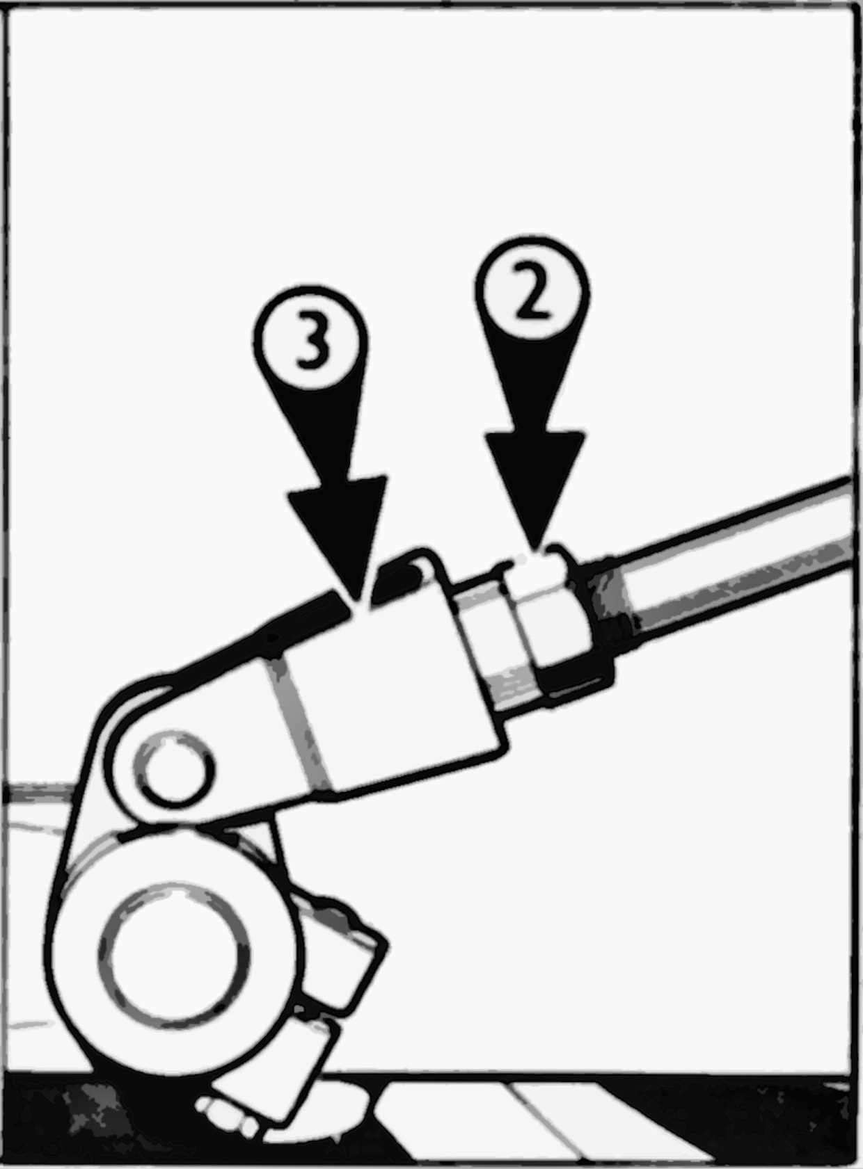 Jos polkimet painuvat liian syvälle, säätö tapahtuu kiertämällä polkimilta tulevien tankojen päissä olevia haarukoita (1), niin että tankojen pituus lyhenee. Ensimmäiseksi on löysättävä lukitusmutterit (2) ja irrotettava haarukoiden tapit. Kuva: Valmistaja