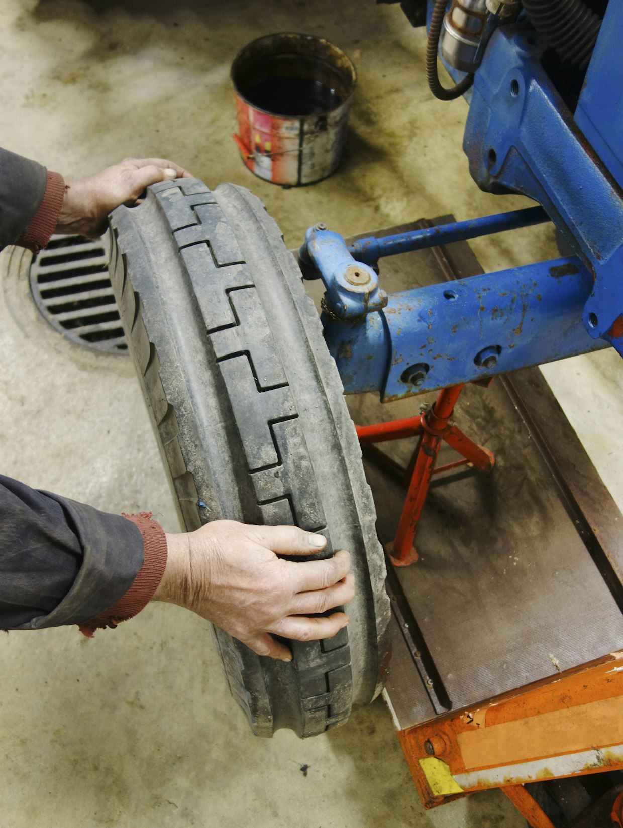 Traktorin huono ohjattavuus oli ennestään tiedossa. Etuakselin pyöränlaakerit testattiin tukemalla akseli pukkien päälle. Toisen pyörän laakerit olivat vaihtokunnossa. Pääsyylliseksi havaittiin ohjaussimpukka, josta aiheutui rattiin neljänneskierroksen klappi. Kuva: Jussi Laukkanen