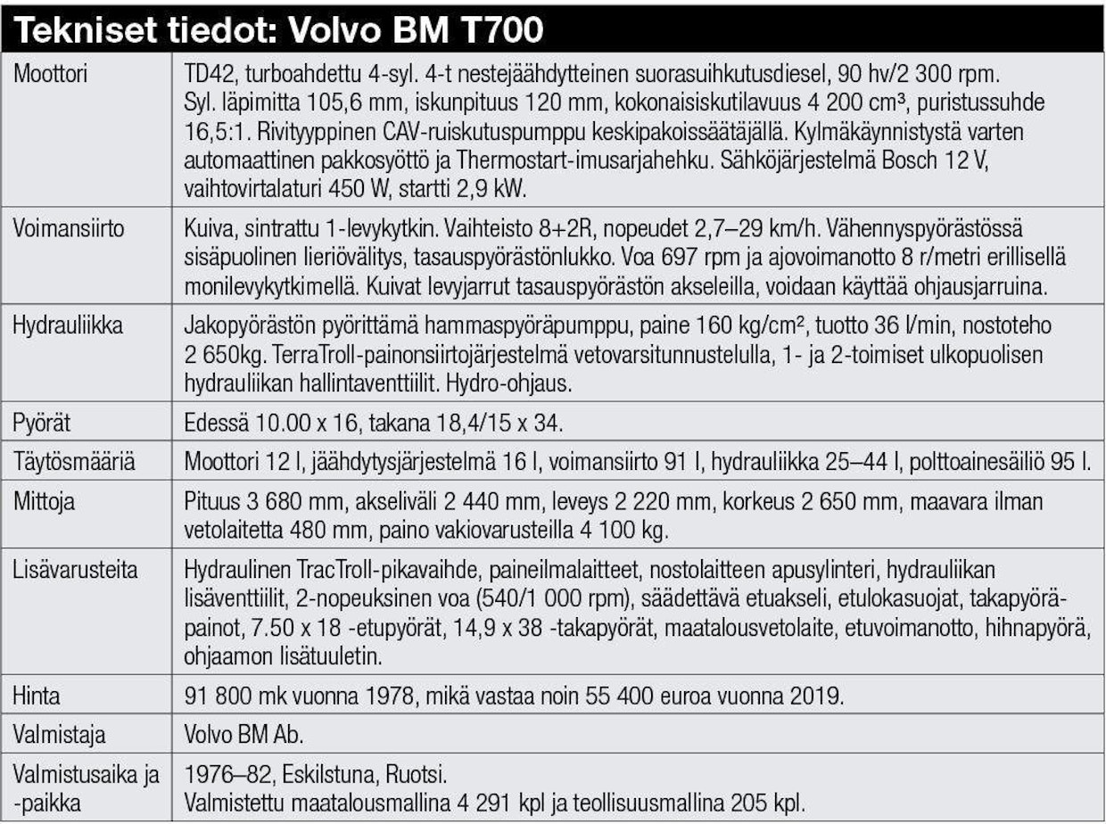 Niitä järjestyi vuodesta 1976 lähtien, jolloin esiteltiin Garrett-turbolla varustettu 90 hv:n Volvo BM T700. Painoero oli kaventunut suunnilleen viiteensataan kiloon, mutta vieläkään ei oltu höyhensarjassa. Turboa ja muutamia voimansiirron vahvistuksia lukuun ottamatta erot T650:n ja T700:n välillä olivat olemattomia. Tuon ajan turbojen tapaan T700 oli kierroskone, parhaat väännöt löytyivät 1600 kierroksen kohdalla. 1970-luvun lopulla selvisi, että Volvo-traktoreiden valmistus tulisi piakkoin päättymään. Kun tämä vuonna 1982 toteutui, niin viimeisen T650:n valmistumisesta uutisoitiin ruotsalaisissa lehdissä kuin jonkun julkisuuden henkilön kuolemasta. Volvo BM oli osa ruotsalaisviljelijöiden identiteettiä.
