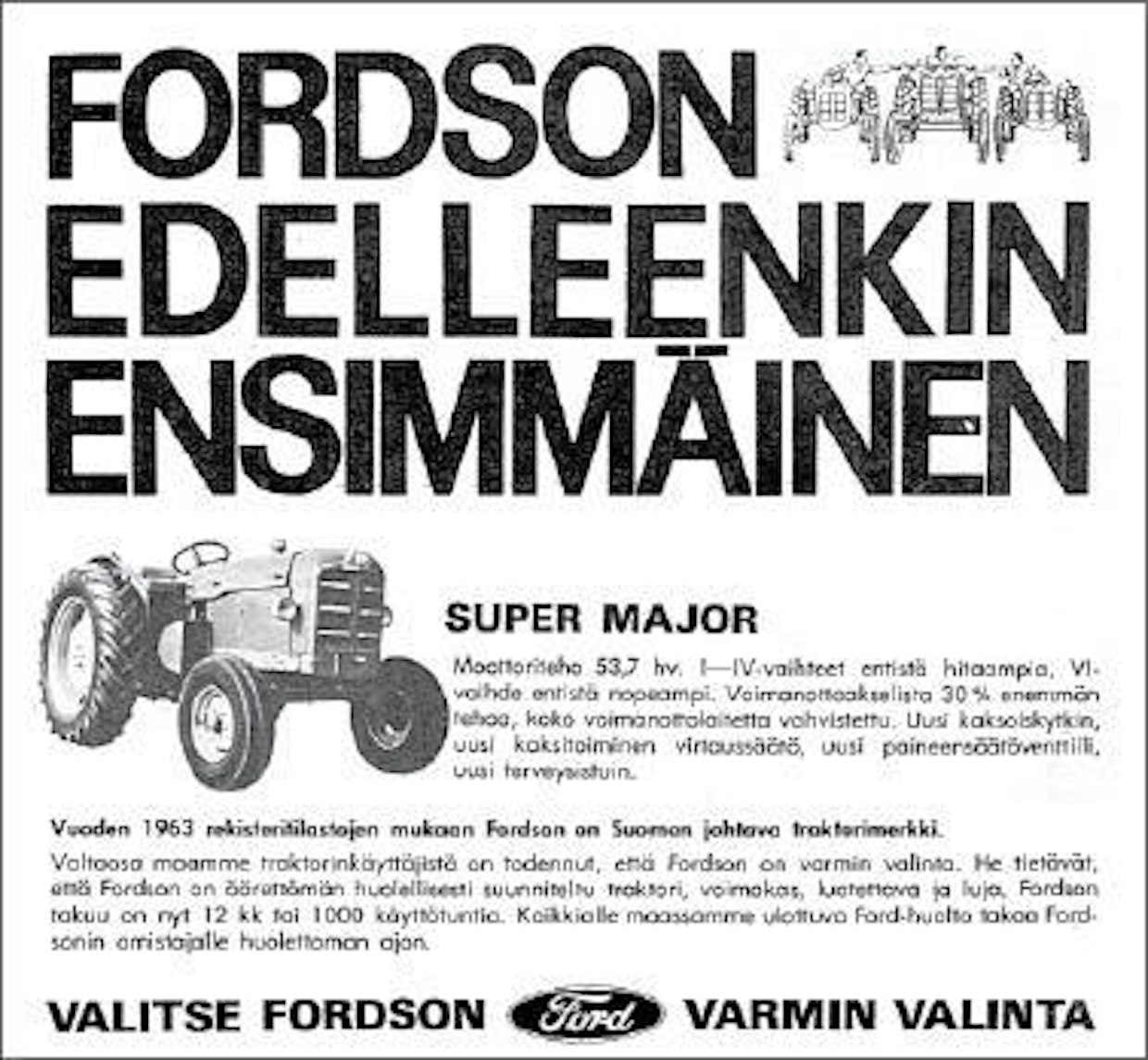 Heinäkuussa 1963 markkinoille tullut, uudistettu Fordson Super Major oli 47-vuotiaan Fordson-merkin viimeinen traktorimalli. Fordsonin sarjatuotanto päättyi tarkalleen vuotta myöhemmin, kun viimeinen Super Major koottiin lokakuussa 1964. Englannissa traktorista käytettiin nimitystä ”The New Performance” (uusi suorituskyky), mutta meillä puhuttiin arkisemmin harmaalokarisesta Majurista. Fordson kehittyi ensimmäisestä vuoden 1917 F-mallista Super Majoriksi monen muutoksen kautta. Rautapyöräisen ”Äffän” ja tämän viimeisen Fordson-mallin ainoa yhteinen tekijä on jokseenkin samanlainen perusvaihteisto. Kuva: Kimmo KottaFordson N vaihtui vuonna 1945 Fordson Major E27N -malliin. Entistä olivat vain moottori ja vaihteisto. Lisävarusteena tähän ns. Mörkö-Majuriin sai kumipyörät, sähköstartin, nostolaitteen ja jopa kuusisylinterisen dieselkoneen.