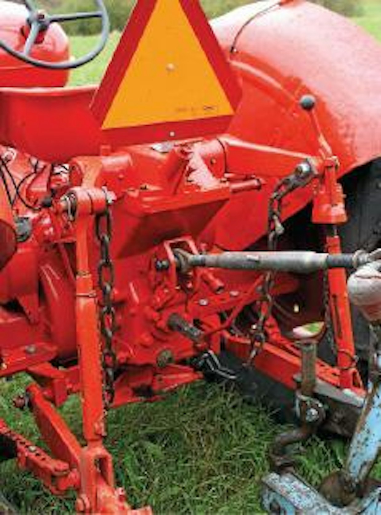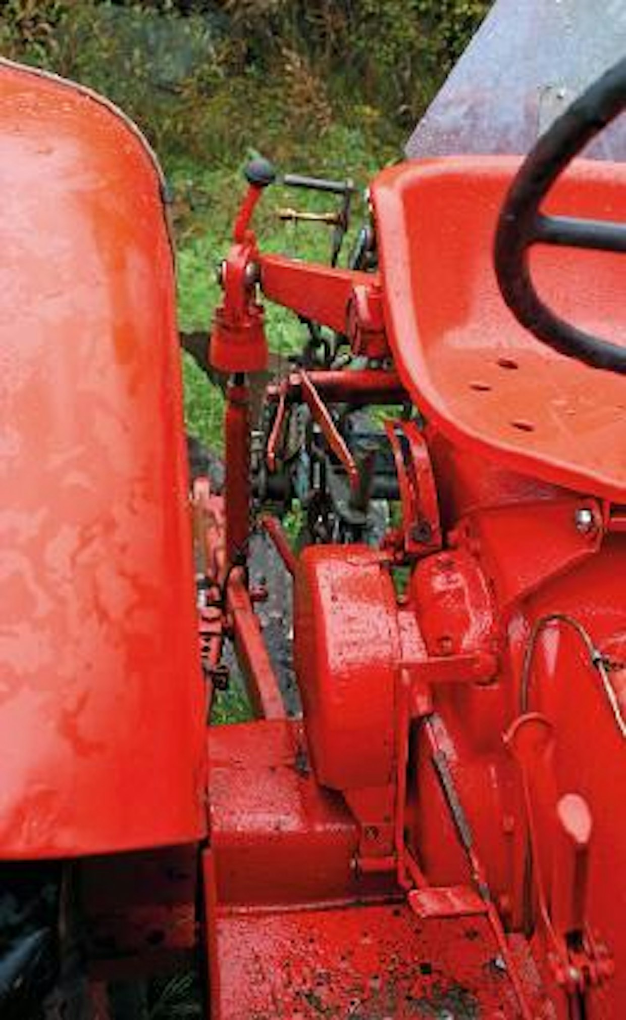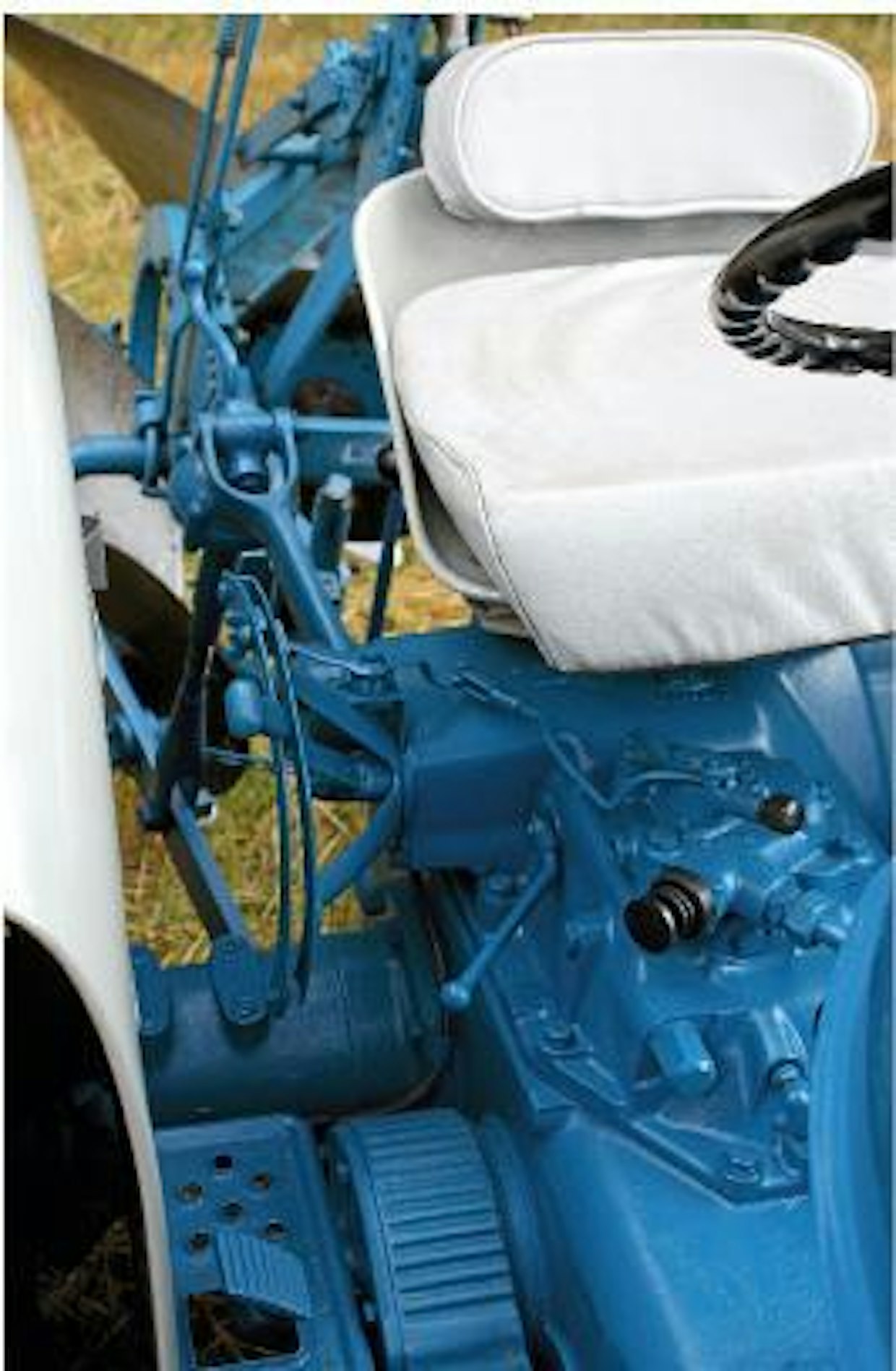 Viimeisimmässä mallimuutoksessa Fordsoneiden vakiovarusteeksi tuli jousitettu istuin, minkä vuoksi Super Majorissa istutaan varsin korkealla. Kuvan traktori poikkeaa normaalista Suomi-mallista maatalousvetolaitteensa ja erillisellä kytkennällä varustetun nostetun ulosottonsa puolesta. Näkyvyys vetokoukulle, tässä tapauksessa vetolaitteelle, on kohtuullisen hyvä. Raskaimpia koneita käytettäessä voidaan työntövarsi kytkeä alimpaan pisteeseen, jolloin painonsiirtojärjestelmä ei toimi. Kuvassa työntövarsi on painonsiirtoasennossa. Kuva: Kimmo KottaKumartelu alkaa virran kytkemisellä, sillä avain on varsin alhaalle sijoitetun paneelin vasemmassa alalaidassa.