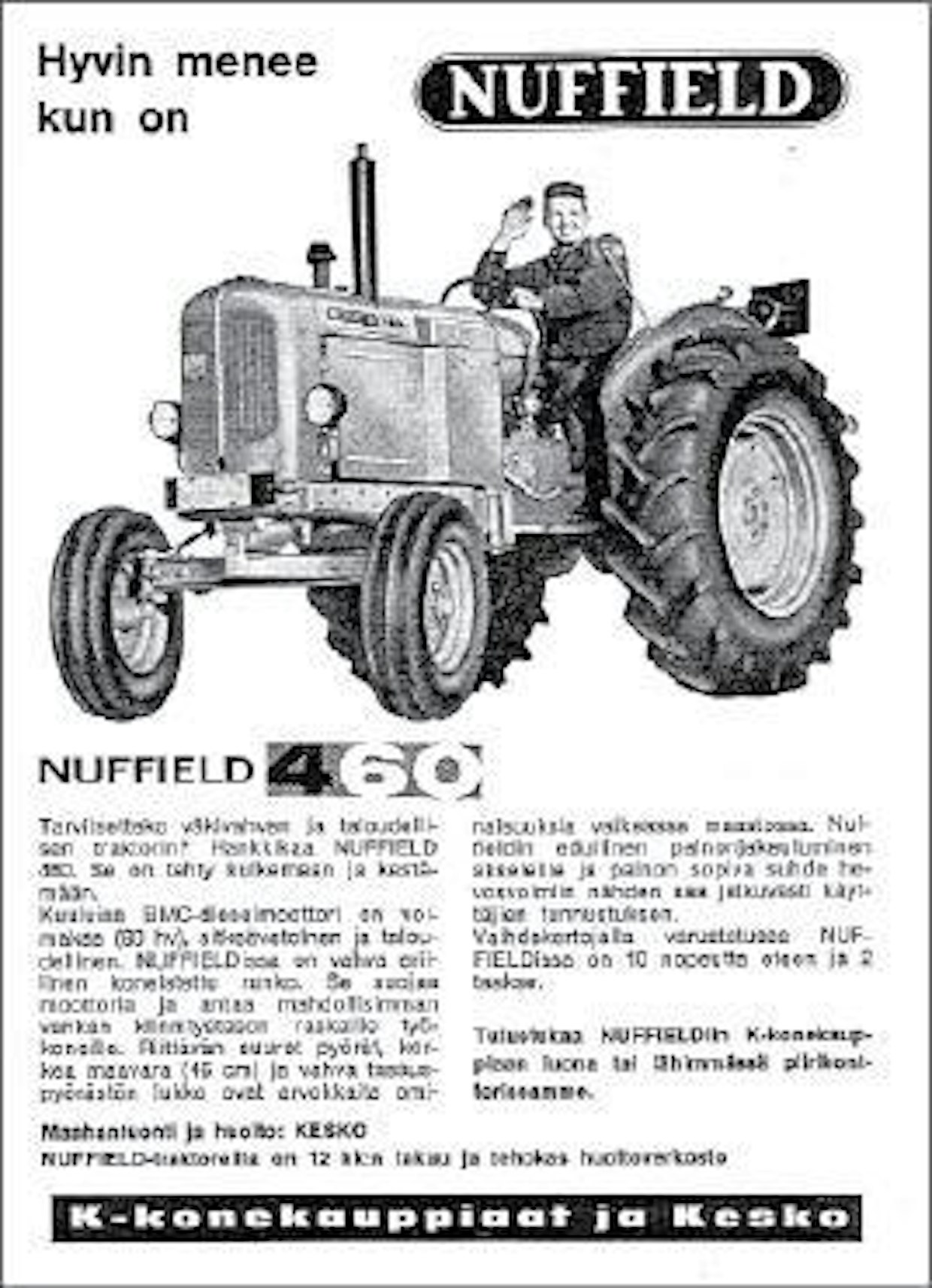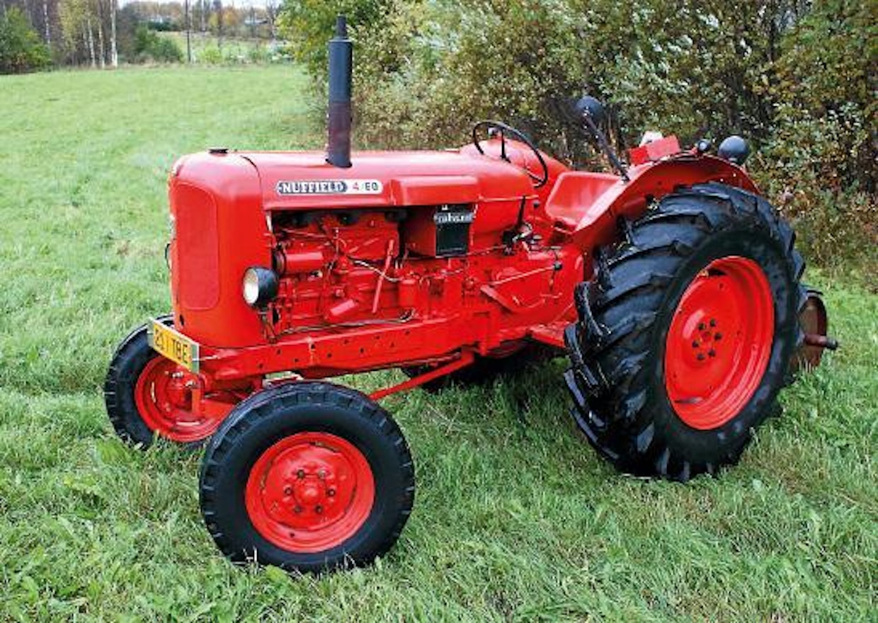 Ensimmäiset Nuffieldit valmistuivat vuonna 1948. Perusrakenne pysyi samana aina vuoteen 1969 saakka, jolloin valmistuivat viimeiset Nuffieldit. Melko pitkälle samoilla piirustuksilla valmistettiin myös Leyland-traktorit, jotka jatkoivat Nuffieldin perinteitä 1980-luvun lopulle. Nuffieldin tavaramerkki oli erityisen järeä runko, joka mahdollisti traktorin käytön mm. kaivurialustana. Vuosina 1961–1964 valmistettu 460-malli oli aikansa tehokkain brittitraktori. Nuffieldin tärkein vientimaa oli Suomi. Kuva: Kimmo KottaNuffieldit varustettiin vuodesta 1954 lähtien yhtymän omalla BMC-suorasuihkutusdieselillä. Vuonna 1957 markkinoille tuli pienempi, kolmisylinterinen Universal Three -malli, jolloin nelisylinterisen traktorin mallimerkintä DM4 vaihtui muotoon Universal Four. Uudessa mallissa amerikkalaistyyppinen takaraidevälin säätö oli vaihtunut tavanomaiseen järjestelmään. Tasauspyörästön lukko tuli varusteeksi pari vuotta myöhemmin.
