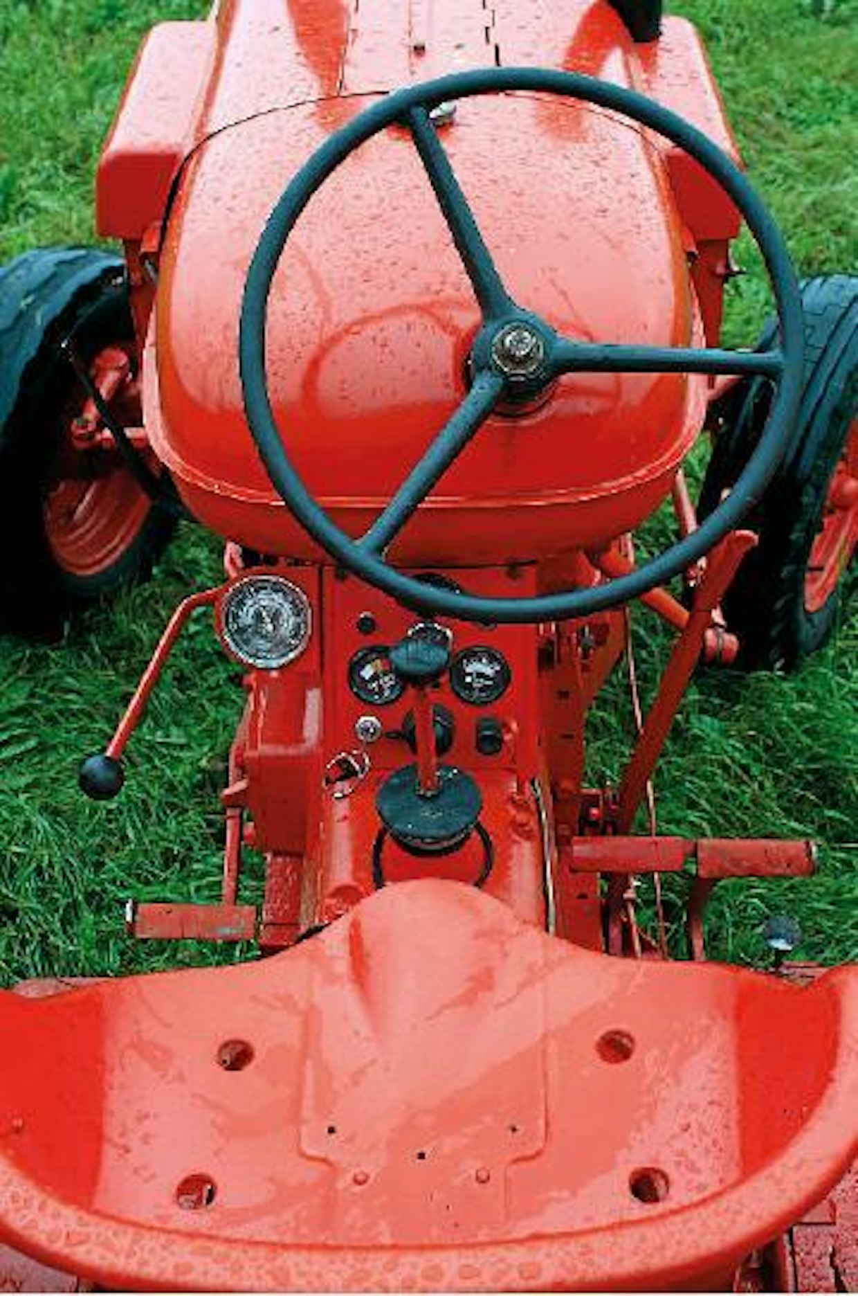 Nuffieldin ohjaamon vasemmassa etukulmassa on jälkiasennetun kertojan hallintavipu, ja sen yläpuolella käsikaasu. Mittaritaulun vasemmalla puolella on kierrosluvun, nopeuden ja käyttötunnit näyttävä yleismittari. Varsinaisessa mittaritaulussa vasemmalta katsoen ovat lämpö-, ampeeri- ja öljynpainemittarit. Yläpuolella sammutin, mittarivalo ja valokatkaisija. Alla virtalukko, äänimerkki ja käynnistysnappi. Vaihteiston kannessa on vaihdevipu ja öljyn mittatikku. Oikealla puolella ovat kaihtimen säätö, käsijarruvipu, yhteen lukittavat jarrupolkimet ja jalkakaasu. Kuva: Kimmo KottaToisin kuin Majorissa, Nuffieldissa istutaan matalalla. Astinlaudat ovat lähes traktorin pohjan tasalla, ja jalkoväliin jäävä vaihteiston korkea kotelo lisää mataluuden tuntua. Istuin on jämäkkä ja varustettu korkeahkolla selkänojalla. Jousitus puuttuu.