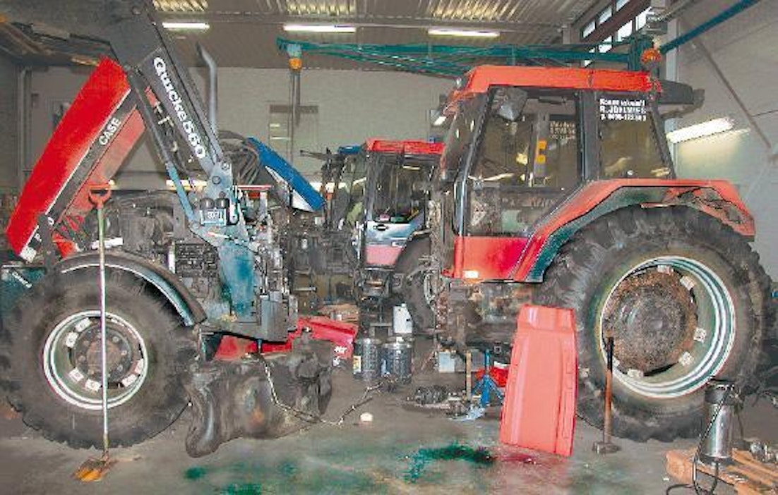 Traktoriin tehtiin vetolevyn vaihto. Katkaistun traktorin etuosaa sovitetaan takaisin omalle paikalleen. Kuva: Matti Värri"Kevättöiden taas lähestyessä kannattaa jokaisen viljelijän tarkistaa koneidensa kunto, ellei sitä ole vielä tehnyt. Kone kannattaa huoltaa, vaihtaa kulutusosat uusiin ja korjauttaa ne viat, jotka koneen käytössä tai sen huoltotarkistuksessa ovat tulleet esille", sanoo lappeenrantalainen huoltoyrittäjä Veli-Matti Särkkä. "Luonnollisesti huoltotoimenpiteet aiheuttavat kustannuksia, mutta siitä huolimatta ei huollosta tai korjauksista kannata tinkiä."